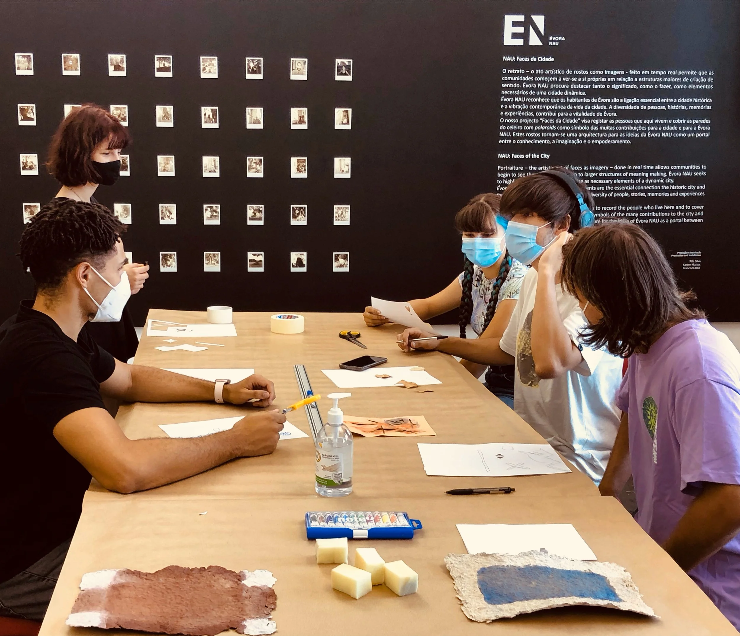 Manuela Jardim, artista multimédia e natural de Portugal. Manuela tem um profundo interesse pela diáspora africana portuguesa; texturas e cores de Cabo Verde e Nova Guiana encarnam o seu trabalho ao exemplificar a beleza dos têxteis da diáspora. Manuela expôs uma grande escultura chamada Azul e drapeados têxteis das paredes, que se inspiram na diáspora e são feitos aqui em Lisboa, e agora em Évora, Portugal. Duas estudantes voluntárias da Escola de Artes da Universidade de Évora ajudaram a criar estes têxteis, a montar a exposição e a conduzir os workshops desta exposição, demonstrando o poder da colaboração intercultural para construir a literacia visual.No final da sua residência artística, Manuela Jardim liderou o primeiro workshop onde ensinou a sua técnica de fazer papel reciclado. O segundo workshop foi liderado pelas voluntárias do Évora NAU onde foram criados carimbos e stencils que utilizaram para pintar o papel reciclado, agora seco, juntamente com a nossa comunidade eborense.